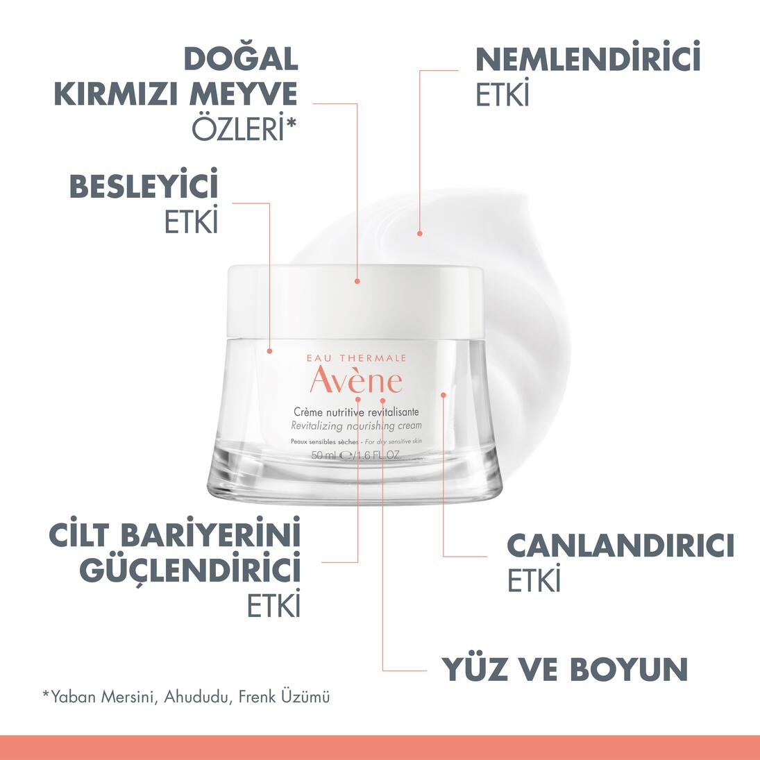 Avène Termal Suyun yatıştırıcı, rahatlatıcı özelliklerini ve zengin içeriği ile besleyici bir formüle sahip olan Avène Revitalizing Nourishing Kuru ve Hassas Ciltler için Besleyici ve Canlandırıcı Krem, Cildin üst katmanlarını nemlendirir ve besler. Cildin konforunu, esnekliğini ve ışıltısını yeniden kazandırmasına yardımcı olur. Cildin koruyucu bariyerini yeniden yapılandırır.