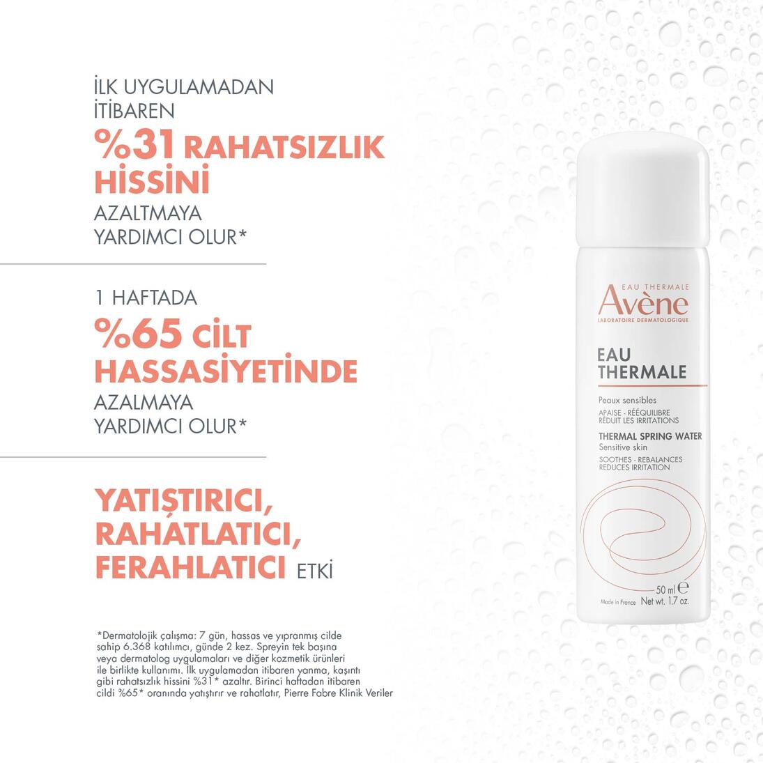Termal su, cilt bariyerini destekleyen mineralleri içeren zengin kaynak sularıdır. Tüm cilt tipleri için hassasiyetlerin giderilmesinde yardımcı olur. Avène Termal Su, hassas, aşırı hassas, alerjik ve yıpranmış ciltlerin bakımı için uygundur. Yatıştırıcı, ferahlatıcı ve rahatlatıcı etkiye sahiptir. Makyaj öncesi cildi hazırlamaya ve makyaj sonrası cildi sabitlemeye yardımcı olur. Yağlı ve akneye eğilimli ciltlerin kullanımına da uygundur. Ayrıca cildi kurutmadan serinlettiği ve rahatlattığı için, sıcak havalarda cildi ferahlatmak için kullanılabilir. Güneş sonrası, kurutucu bakımlardan sonra, tıraş sonrası, epilasyondan sonra, bebek bezi bölgesinde kullanıma uygundur.